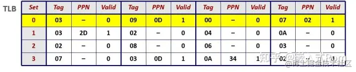 第一项是 0x03,不匹配,第二项是 0x09,不匹配,第三项是 0x00,匹配,但是有效位为 0。所以,这次 TLB 缓存不命中。