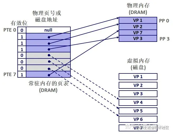 - 页表条目(page table entry PTE) ,虚拟地址与物理地址具体对应记录。页表是由多个页表条目PTE组成的数组,PTE 由一个有效位 和 n位地址字段组成,如果设置了有效位,那么地址字段就标识DRAM中相应的物理页的起始位置。