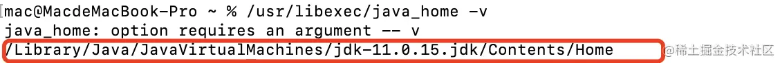 1、首先需要知道jdk的安装目录,在终端中输入命令/usr/libexec/java_home -v,下图红色框中的就是jdk的安装目录,这个以后会用到。