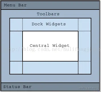 MainWindow的结构分为五个部分:菜单栏(Menu Bar)、工具栏(Toolbars)、停靠窗口(Dock Widgets)、状态栏(Status Bar)和中央窗口(Central Widget)。可以用下面的图形表示之。