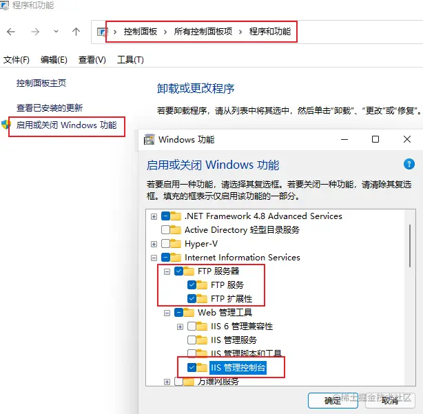- 控制面板 -> 程序和功能 -> 启动或关闭Windows功能 -> FTP服务