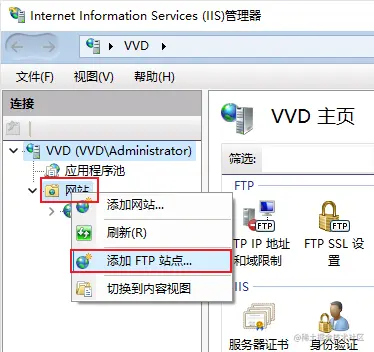 - 右键 -> 网站 -> 添加FTP站点