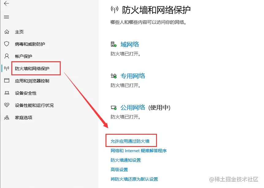 此时需要设置 关闭防火墙 或者 允许防火墙通过应用 ,当然选择后者