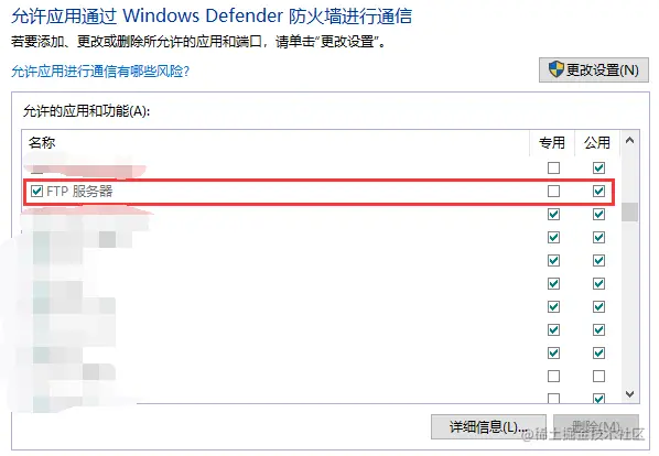 Windows Defender 安全中心 -**> **防火墙和网络保护 -> 允许应用通过防火墙 -> 更改设置 -> 勾选 Ftp服务器(推荐使用这种方式)