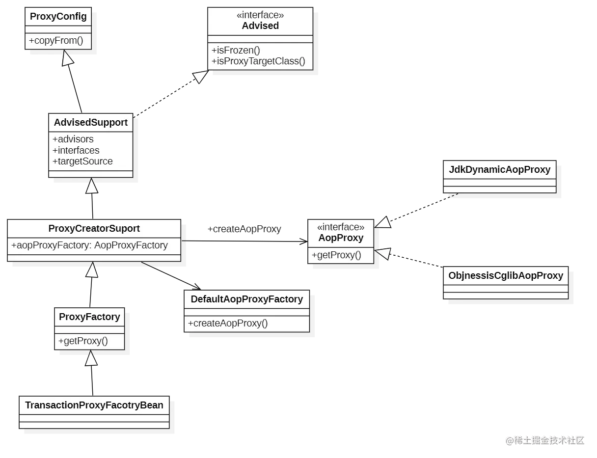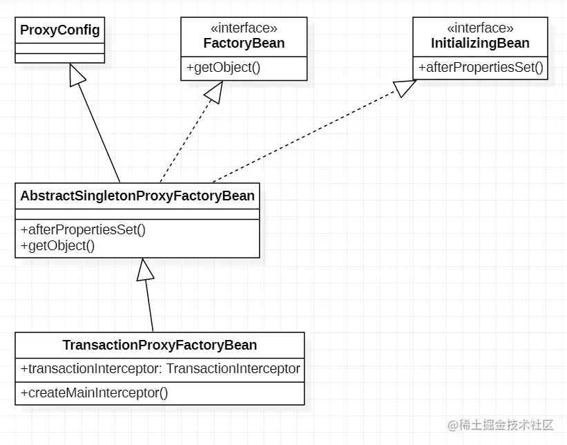 先从最简单的事务配置方式 TransactionProxyFacotryBean 来看Spring是怎么完成创建Proxy对象的.