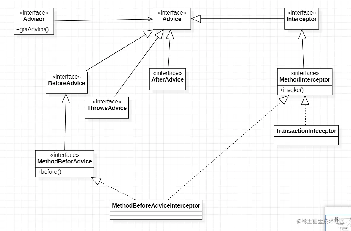 MethodBeforeAdapter和MethodBeforeAdviceInteceptor就将MethodBeforeAdvice适配成MethodInteceptor.