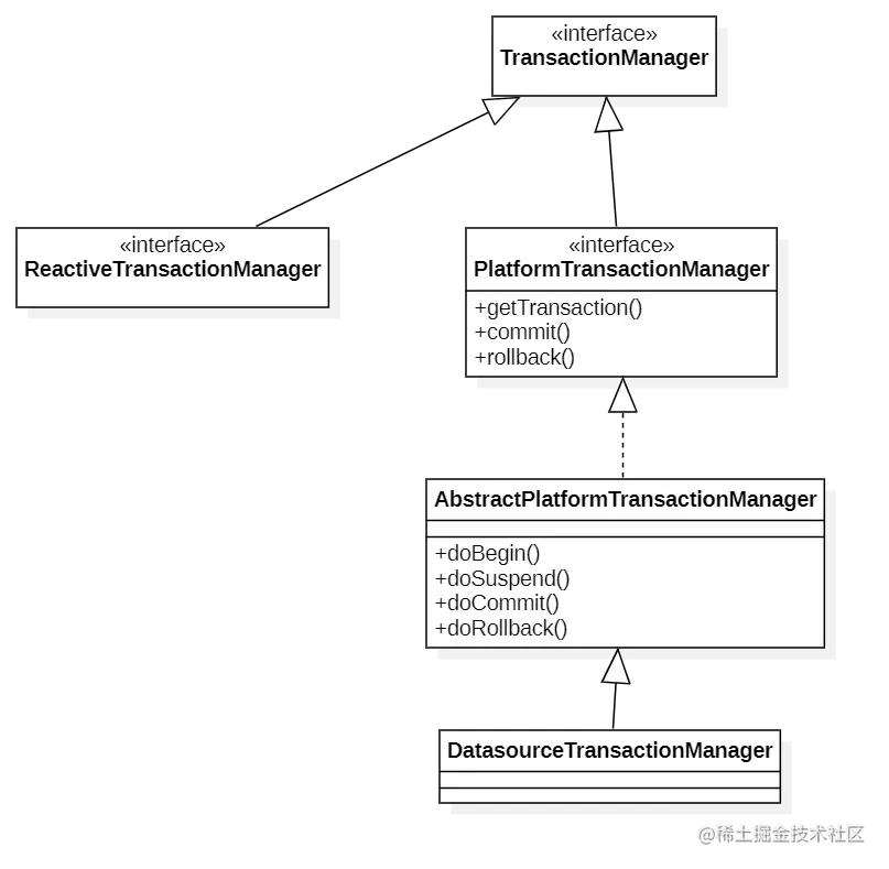 在Abstract中实现了了对事务传播级别的控制,将事务的具体实现委托给具体的实现类,比如DatasourceTransactionManager实现对数据库Database的事务实现.