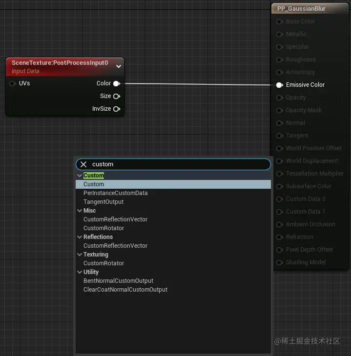 打开 Unreal 编辑器,在 Material 目录下新建一个材质,然后创建一个 Custom 节点: