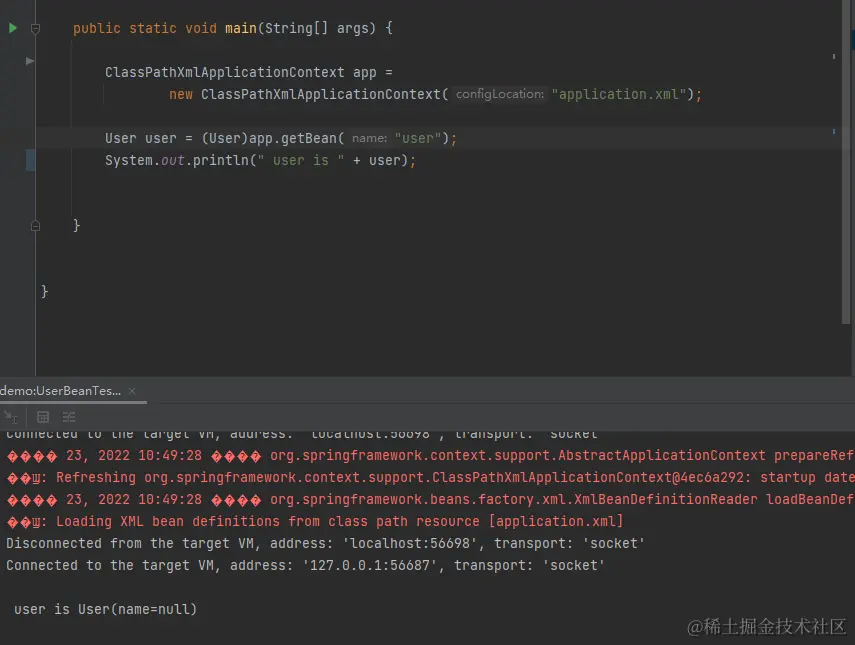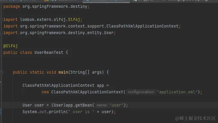 这里采用的是 xml 的配置文件方式来实现 bean 的声明,并使用 ClassPathXmlApplicationContext 来加载配置文件获取 bean。