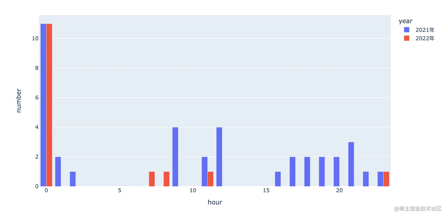 px.bar(df4,x="hour",y="number",barmode="group",color="year")
