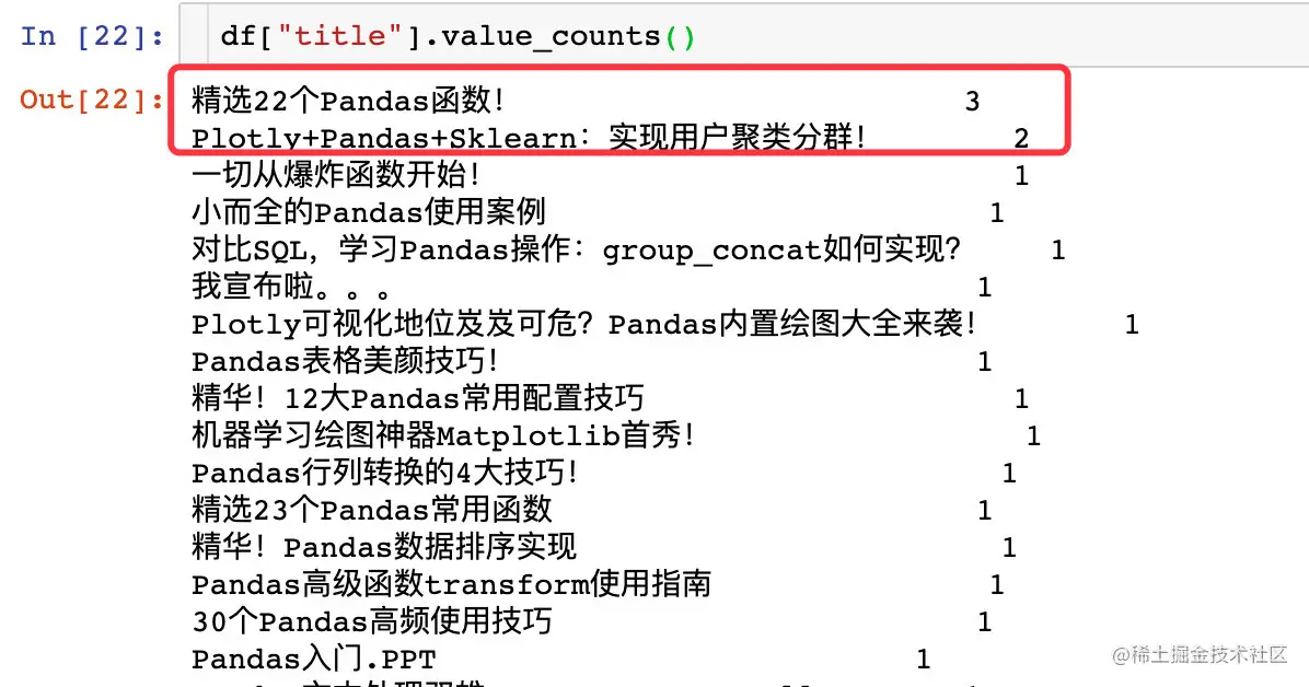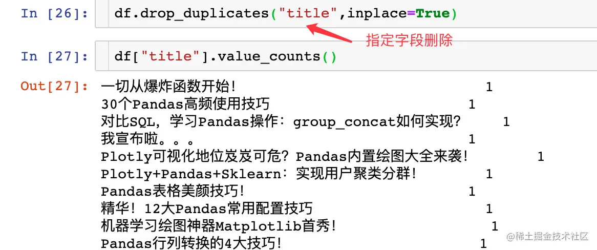 通过title字段来删除重复值:再进行统计的时候就没有重复值了
