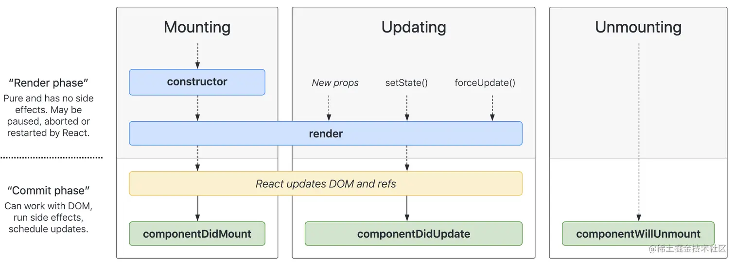 constructor() static getDerivedStateFromProps() render() componentDidMount()