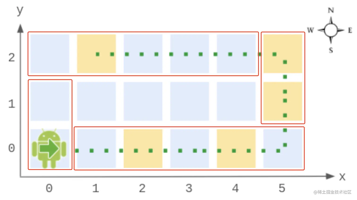 - 如果机器人下一步将到达的格子超出了边界,机器人会逆时针转 90 度,然后再尝试往前一步。