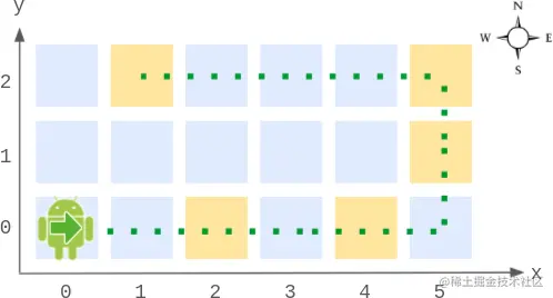 Robot robot = new Robot(6, 3); // 初始化网格图,机器人在 (0, 0) ,朝东。