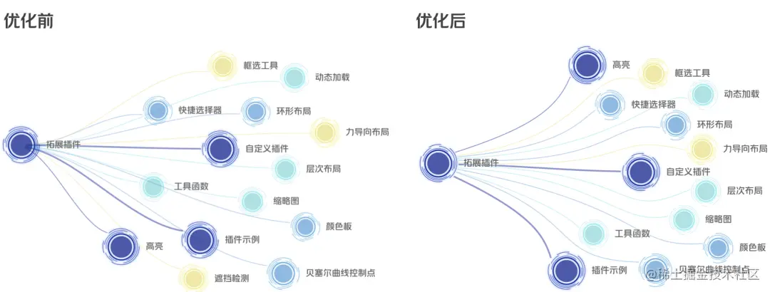 通过多边散列排布,改变边线类型,并调整样式参数,下面是我们将图谱中凌乱无序的边线优化后的效果: