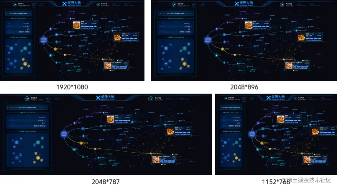 这套大屏适配技术方案支撑了美团大脑历次的版本迭代。此前在参展亚洲美食节时,由于会场搭建情况比较复杂,屏幕分辨率经历了多次变更,只花费了0.5人日就做到了各种不同分辨率的定制、开发和适配工作。