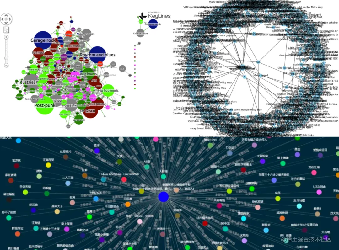 在以上几张图中,虽然将知识图谱的数据呈现了出来,但是元素数量非常多,信息杂乱,给用户的观感是“眼花缭乱”。下面我们会介绍针对这类问题的解决方案。