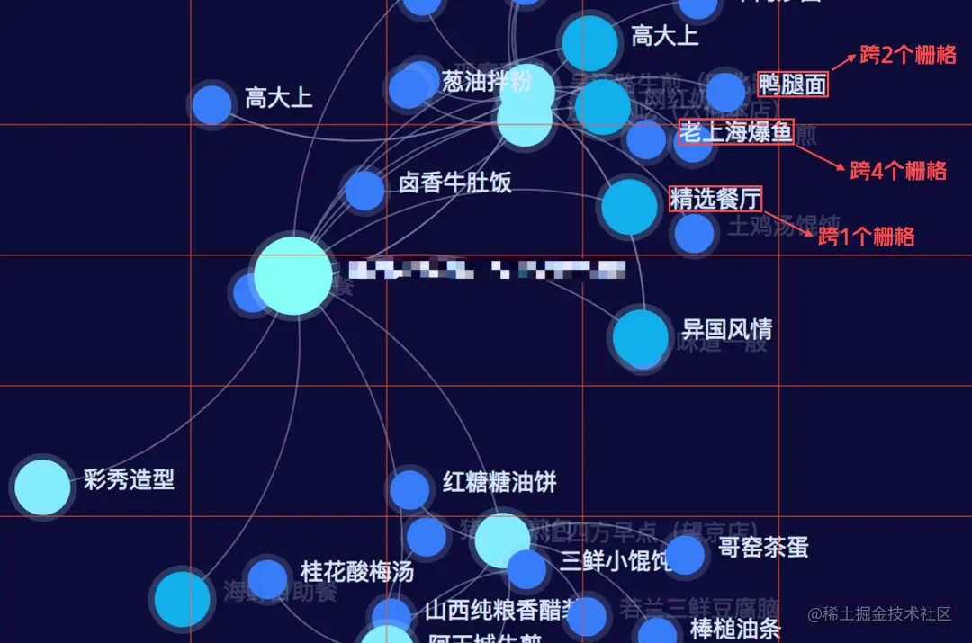 但这种解法的时间复杂度会随着节点的增多逐渐变得不可控。假如我们有100个节点,最多需要O(n!)的时间复杂度才能计算完毕。我们这里采用栅格划分的方式来做优化,先对画布进行栅格划分,然后确定节点所在的一个或多个栅格,在进行碰撞检测的时候,只需要和自己同栅格的节点做对比即可,因为不同栅格内的节点一定不会出现碰撞的情况。