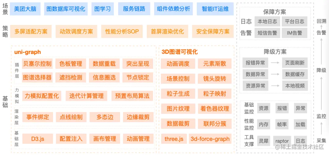 在图关系可视化上,国内外有很多图可视化的框架,由于美团的业务场景中有很多个性化的需求和交互方式,所以选择了D3.js作为基础框架,虽然它的上手成本更高一些,但是灵活度也比较高,且功能拓展非常方便。D3.js提供了力导向图位置计算的基础算法,同时也有很方便的布局干预手段。于是,我们基于D3.js封装了自己的知识图谱可视化解决方案——uni-graph。整体的功能与架构设计如下图所示,下面我们会介绍一些uni-graph的功能细节和可视化的通用技术策略。