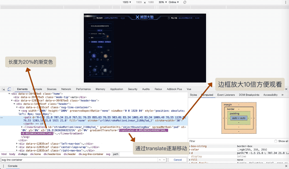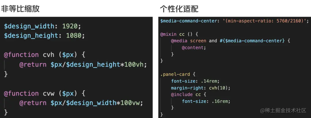 美团大脑呈现的终端场景非常复杂,有PC/Mac端屏幕、大屏电视、巨型宽屏等。各个屏幕的尺寸比例都有所不同,为了保持统一观感,不能出现滚动条、不能有边缘留白、不能压缩变形。同时在一些重要场合的巨型宽屏上,还要对细节做特定的适配。通过sass的函数和mixin功能可以较好地完成非等比缩放和个性化适配的需求。