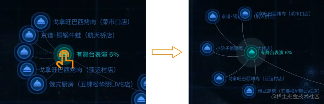 除了上述的基础交互功能外,我们还探索了一些特殊场景的交互。在图谱可视化中交互的目的,是为了从庞大的知识图谱中找到自己关心数据的关联关系,同时也能够观察到这些关联关系在全局画布中的位置。