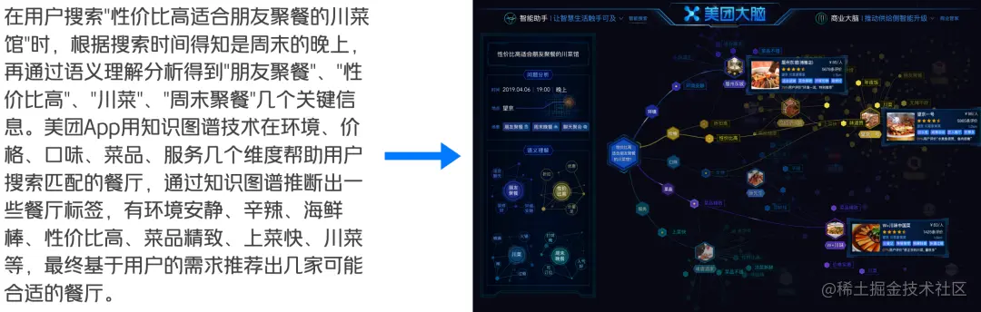 美团大脑是我们团队第一个知识图谱可视化项目,通过该项目的实践,我们积累了一些可视化基础能力和知识图谱可视化的优化策略,让开发效率得到了极大的提升,同时团队开始考虑在交互和表现形式上做进一步的突破。我们也搜集到一些反馈,发现很多人依然对知识图谱这项技术是什么和能做什么了解得不是很清楚。经过团队的头脑风暴,我们认为核心原因是AI技术高深复杂,难以具象化,需要对真实场景进行还原。刚好,知识图谱相对于其他的技术而言其可解释性更强,于是我们决定进行可视化叙事的研发。数据可视化叙事(Visual Data StoryTelling)是通过隐喻对数据进行可视化,并以可视化为手段,向受众讲述数据背后的故事。下面举个例子,来对比一下纯文字与可视化叙事的不同: