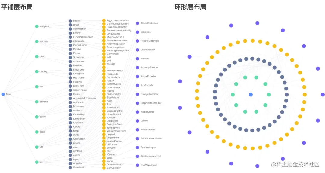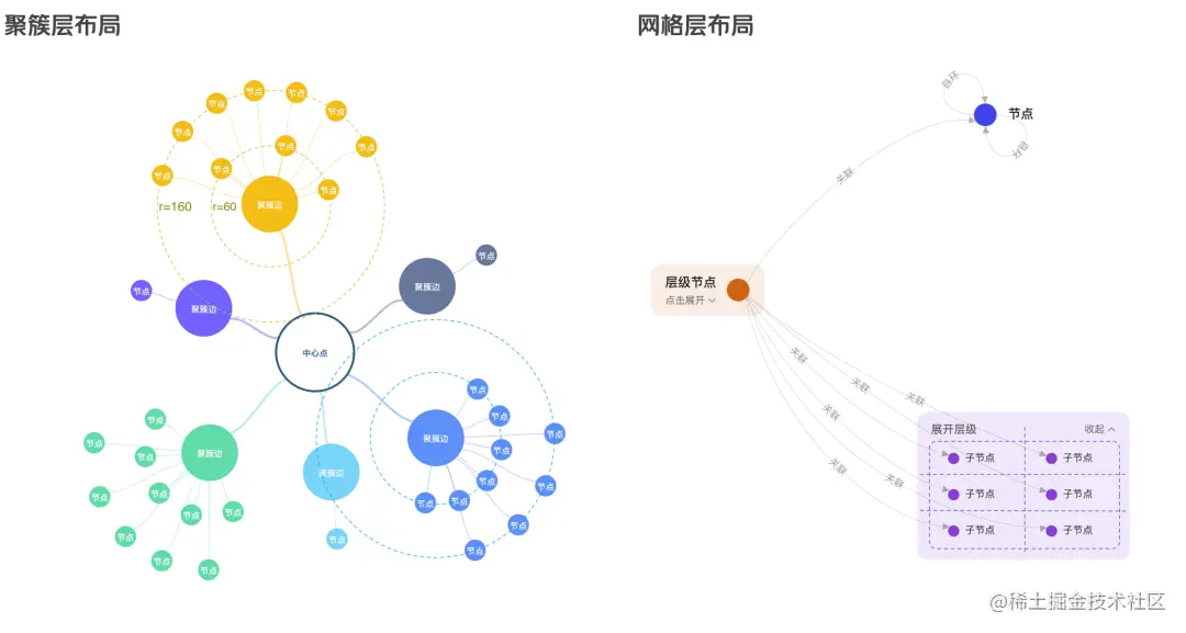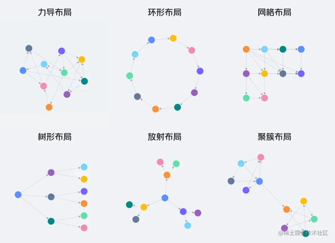 在不同类型的知识图谱中,因数据差异较大,对布局效果的要求也有所不同。能让业务数据有合适的布局来做可视化呈现,是一项比较大的技术挑战。除了下面几种基本的布局之外,我们还探索了一些特定场景下的布局方案。