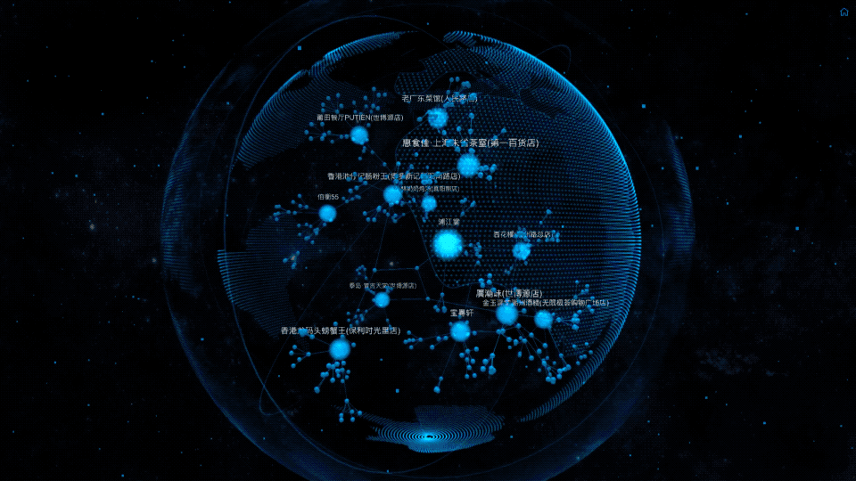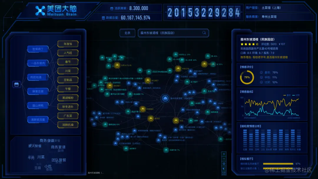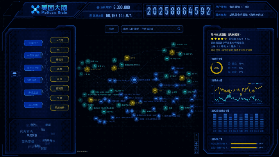 贝塞尔可视化叙事效果我们为知识图谱的可视化叙事设计了几个典型场景,对日常生活中的找店游玩、商户经营分析等需求进行情景再现,直观地将知识图谱是如何服务真实场景的需求展现出来,以下是可视化叙事的效果: