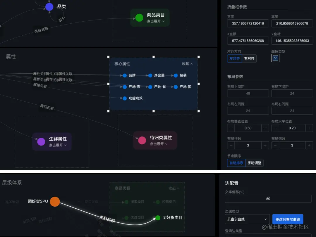 在特定领域的图谱可视化中,通常采用一两种布局即可满足用户的展示需求,因为这些场景下的图谱的关系结构相对固定。但作为平台性质的工具,就需要展示多个领域的图谱。为了更清晰地展现出各领域图谱的特点,布局形态就需要跟随图谱而变化。针对这种场景,我们实现了多项布局参数的配置化,用户可以根据领域图谱的特点优化布局参数,并作为配置保存下来。领域图谱可视化-网格布局参数调整