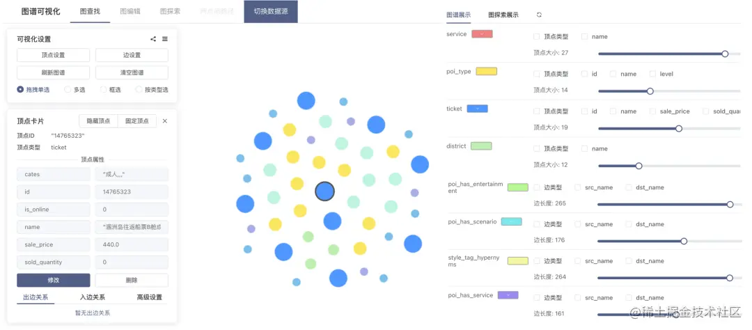 - 图查询应用:以图数据库为主的图谱可视化工具,提供图数据的编辑、子图探索、顶点/边信息查询等交互操作。