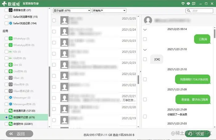 第四步: 扫描完毕后,就可以看到如下界面,左侧的应用栏包含着这款软件能够扫描得出来的数据分类,这个时候只需要从中找到【微信聊天记录】,在右侧找到需要恢复的聊天记录,最后点击【恢复】即可。