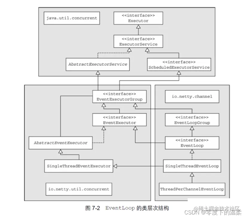 Netty的EventLoop 是协同设计的一部分,它采用了两个基本的API:并发和网络编程。首先,io.netty.util.concurrent 包构建在JDK 的java.util.concurrent 包上,用来提供线程执行器。其次,io.netty.channel 包中的类,为了与Channel 的事件进行交互,扩展了这些接口/类。