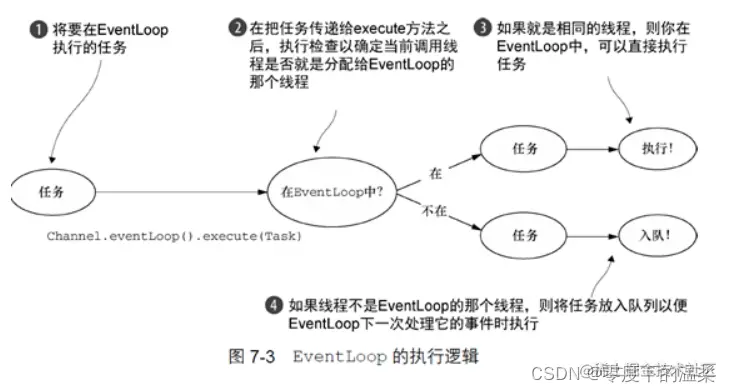 如果(当前)调用线程正是支撑EventLoop 的线程,那么所提交的代码块将会被(直接)执行。否则,EventLoop 将调度该任务以便稍后执行,并将它放入到内部队列中。当EventLoop下次处理它的事件时,它会执行队列中的那些任务/事件。这也就解释了任何的Thread 是如何与Channel 直接交互而无需在ChannelHandler 中进行额外同步的。注意,每个EventLoop 都有它自已的任务队列,独立于任何其他的EventLoop。