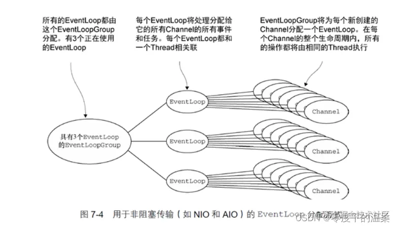 异步传输实现只使用了少量的EventLoop(以及和它们相关联的Thread),而且在当前的线程模型中,它们可能会被多个Channel 所共享。这使得可以通过尽可能少量的Thread 来支撑大量的Channel,而不是每个Channel 分配一个Thread。
