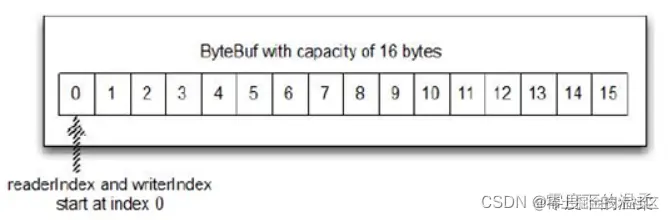 ByteBuf是一个存储字节的容器,最大特点就是使用方便,它既有自己的读索引和写索引,方便你对整段字节缓存进行读写,也支持get/set,方便你对其中每一个字节进行读写,他的数据结构如下图所示:
