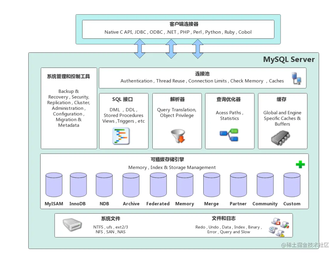 提供与MySQL服务器建立的支持。目前几乎支持所有主流的服务端编程技术,例如常见的 Java、C、Python、.NET等,它们通过各自API技术与MySQL建立连接