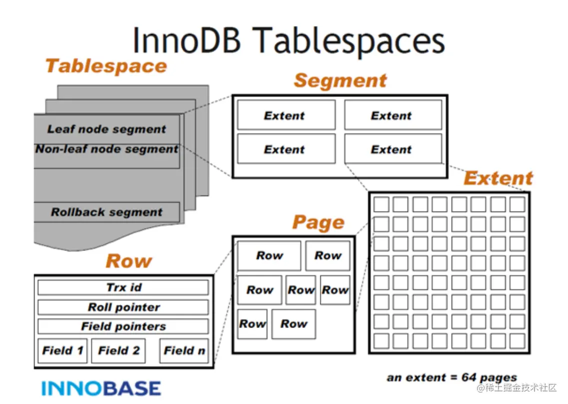段,用于管理多个Extent,分为数据段、索引段、回滚段。一个表至少有两个segment,一个管理索引,一个管理数据。