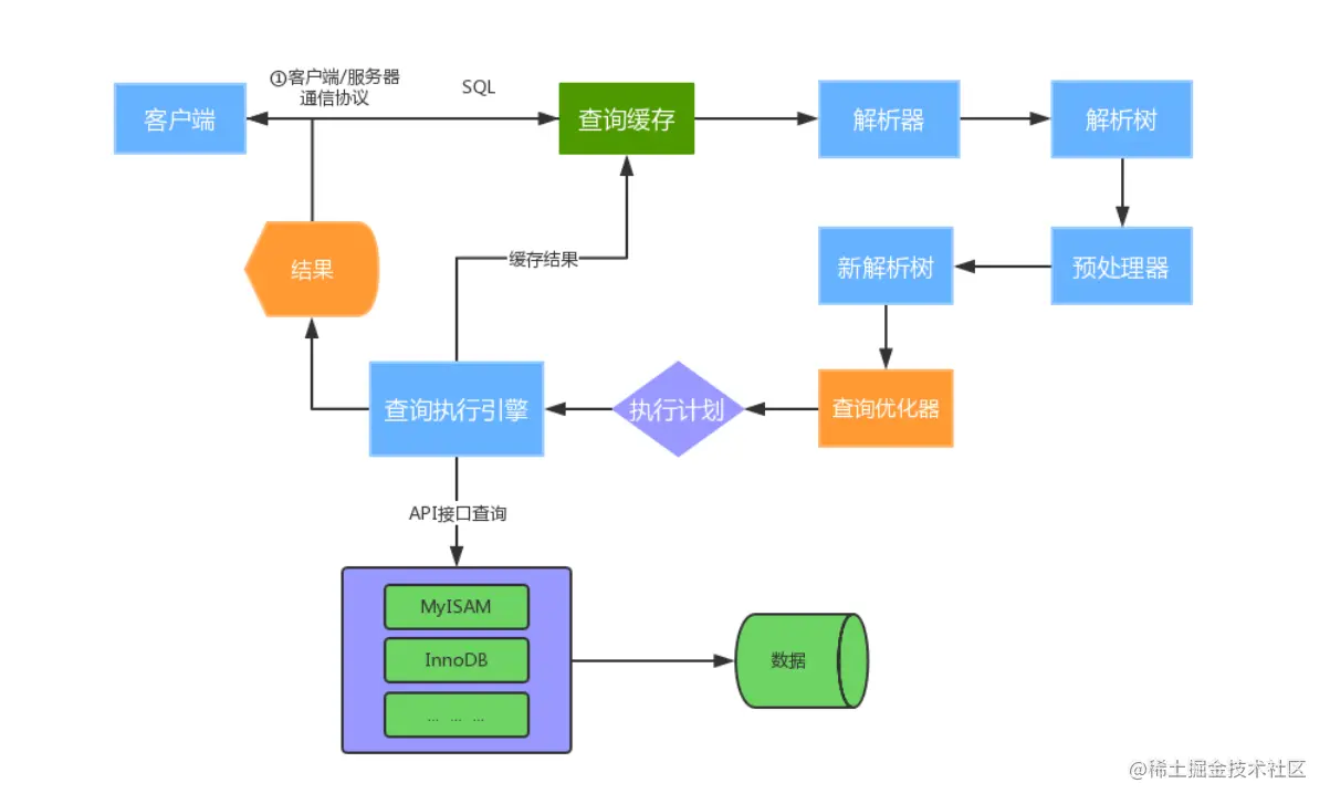 - 查询引擎,查询引擎负责执行SQL语句,此时查询执行引擎会根据 SQL 语句中表的存储引擎类型,以及对应的API接口与底层存储引擎缓存或者物理文件的交互,得到查询结果并返回给客户端。若开启用查询缓存,这时会将SQL语句和结果完整地保存到查询缓存(Cache&Buffer)中,以后若有相同的 SQL语句执行则直接返回结果。