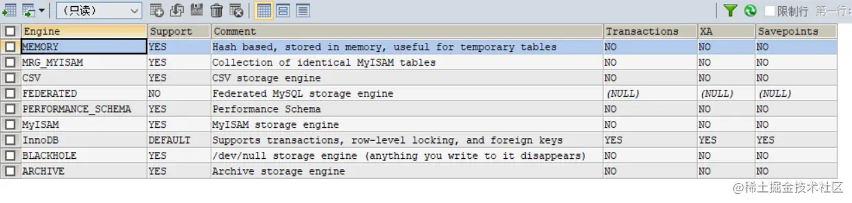 通过SHOW ENGINES命令,可以查看当前数据库支持的引擎信息。