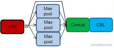 - SPP 从 YOLOv3 起,就有使用 SPP 模块。SPP 是 通过采用 1 × 1、5 × 5、9 × 9 和 13 × 13 的最大池化方式,来进行多尺度特征的融合。