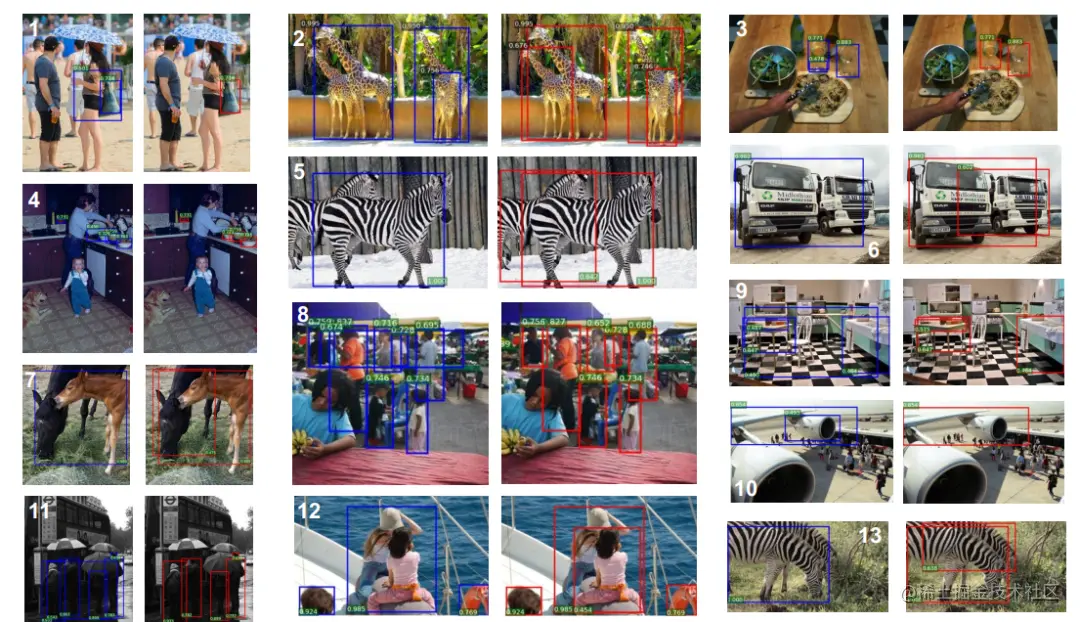当两个目标靠的非常近时,置信度低的会被置信度高的框所抑制,那么当两个目标靠的十分近的时候就只会识别出一个 bbox。为了解决这个问题,可以使用 softNMS。它的基本思想是用稍低一点的分数来代替原有的分数,而不是像 nms 一样直接置零。