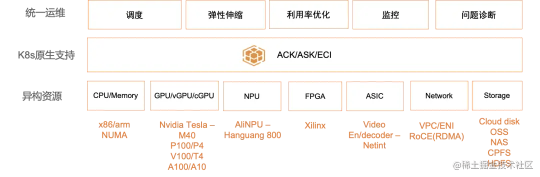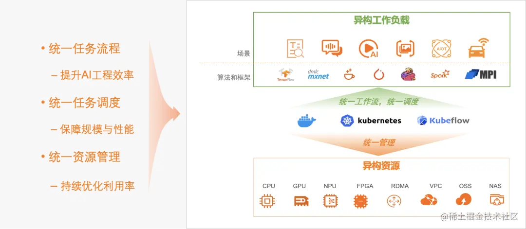 - **异构资源层,**包括异构算力优化和异构存储接入