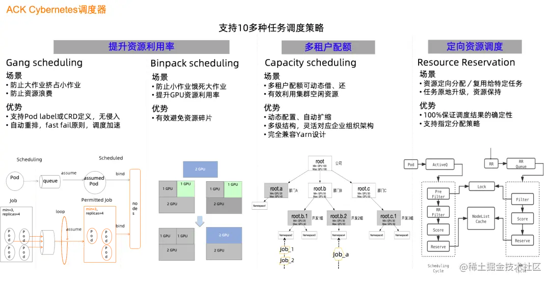 为特定作业预留资源,定向分配或者重复使用。既保证了特定作业获得资源的确定性,也加速了资源分配速度,还支持用户自定义预留策略。