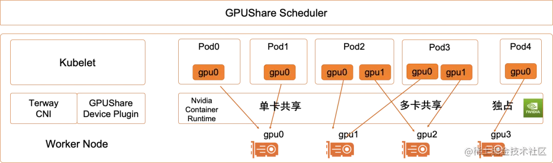 同时,为了避免共享 GPU 的多个容器之间相互干扰,还集成了阿里云 cGPU 技术,确保共享使用GPU的安全性和稳定性。容器间使用 GPU 资源是相互隔离的。不会出现超用,或者发生错误时彼此影响。