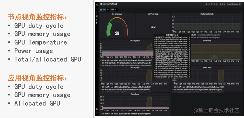 针对 GPU 提供了多维度监控能力,使得 GPU 的分配、使用和健康状态一目了然。通过内置Kubernetes NPD(Node Problem Detector)自动检测和告警 GPU 设备异常。