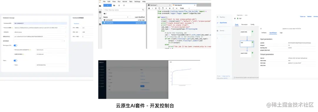 除了命令行工具,Arena 还支持 golang/java/python 语言 SDK,便于用户二次开发。另外,考虑到不少数据科学家习惯使用 Web 界面管理资源和任务,云原生 AI 套件也提供了简单的运维大盘和开发控制台,满足用户快速浏览集群状态、提交训练任务的需要。这些组件共同形成了云原生 AI 作业管理工具集 Arena。