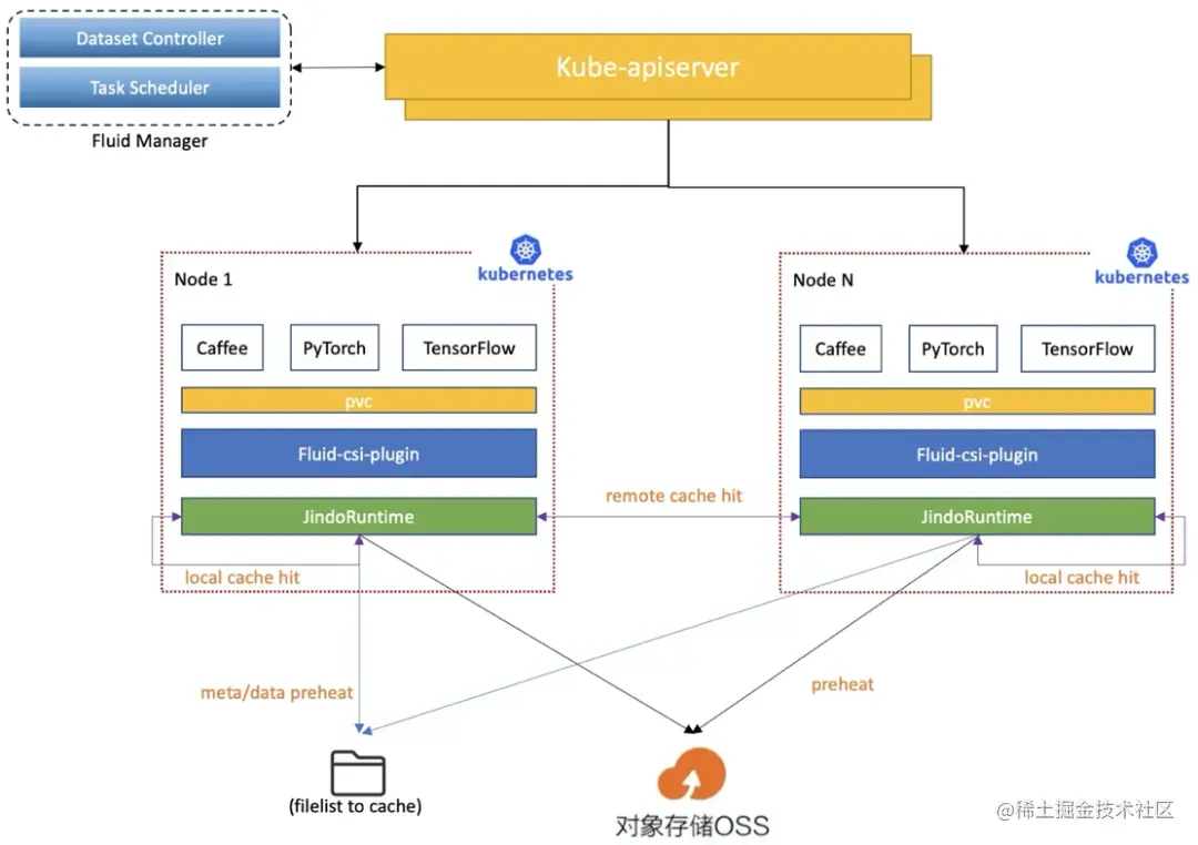 - 通过数据亲和性调度和分布式缓存引擎加速,实现数据和计算之间的融合,从而加速计算对数据的访问。