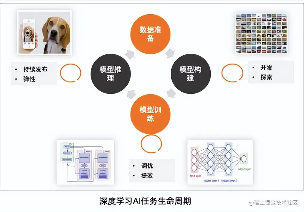 对于 AI 服务的生产过程,主要包含数据准备与管理、模型开发构建、模型训练、模型评测、模型推理服务上线运维等阶段。这些环节以循环迭代的方式,根据线上数据变化,持续优化更新模型,通过推理服务将模型发布到线上,收集到新的数据,进入下一轮迭代。