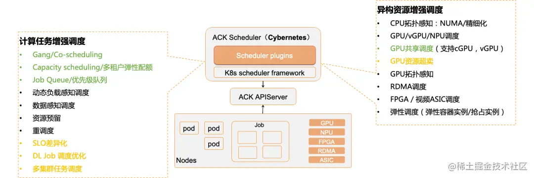 ACK 调度器(Cybernetes**[7]**)扩展 Kubernetes 原生调度框架,实现了很多典型批量调度策略,包括 Gang Scheduling(Coscheduling)、FIFO scheduling、Capacity Scheduling、Fair sharing、Binpack/Spread 等。还增加了新的优先级任务队列,支持自定义的任务优先级管理和租户弹性资源配额控制;也可以集成 Kubeflow Pipelines 或 Argo 云原生工作流引擎,为复杂的 AI 任务提供工作流编排服务。由“任务队列+任务调度器+工作流+任务控制器”组成的架构,为基于 Kubernetes 构建批量任务系统提供了基础支撑,同时也显著提升集群整体资源利用率。