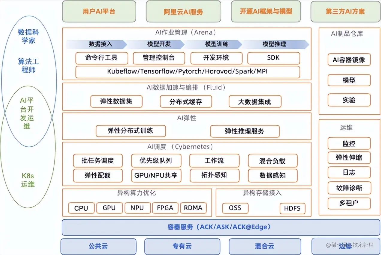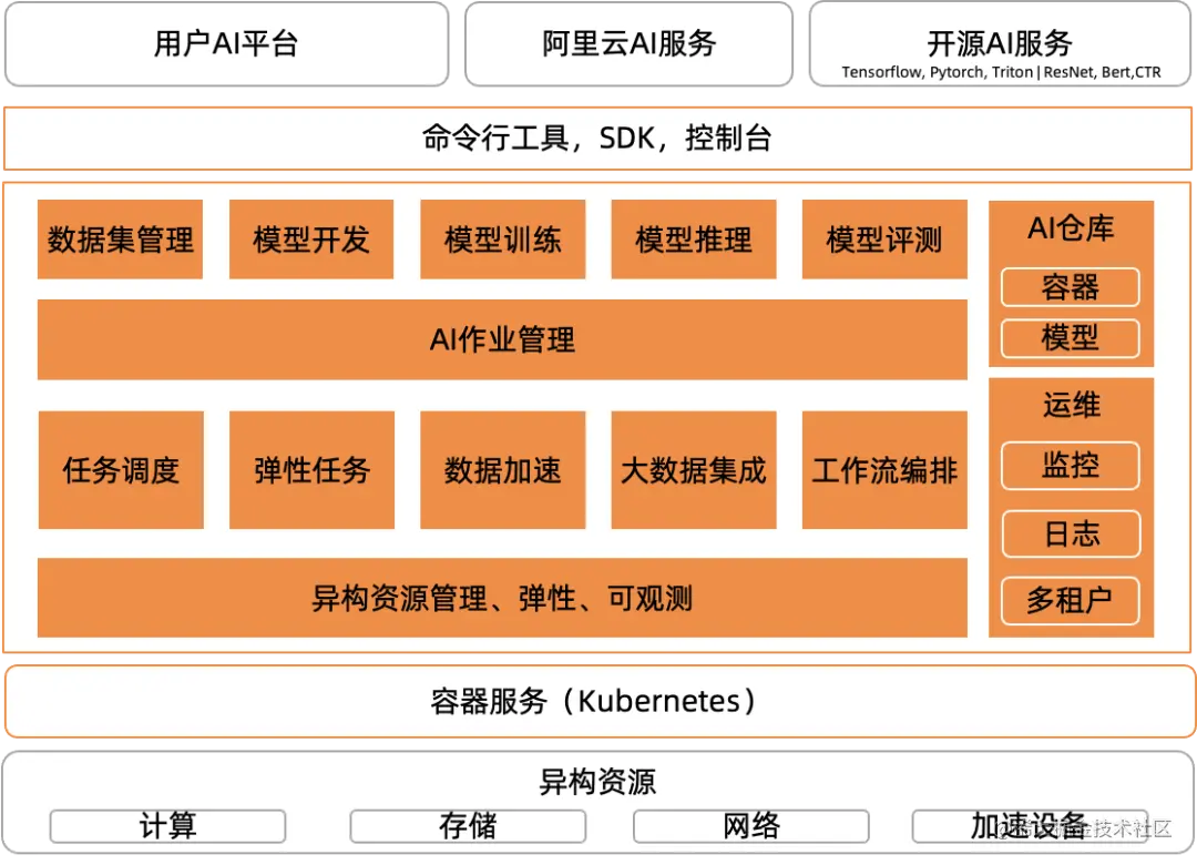 - **AI 数据加速与编排层,**包括数据集管理,分布式缓存加速,大数据服务集成